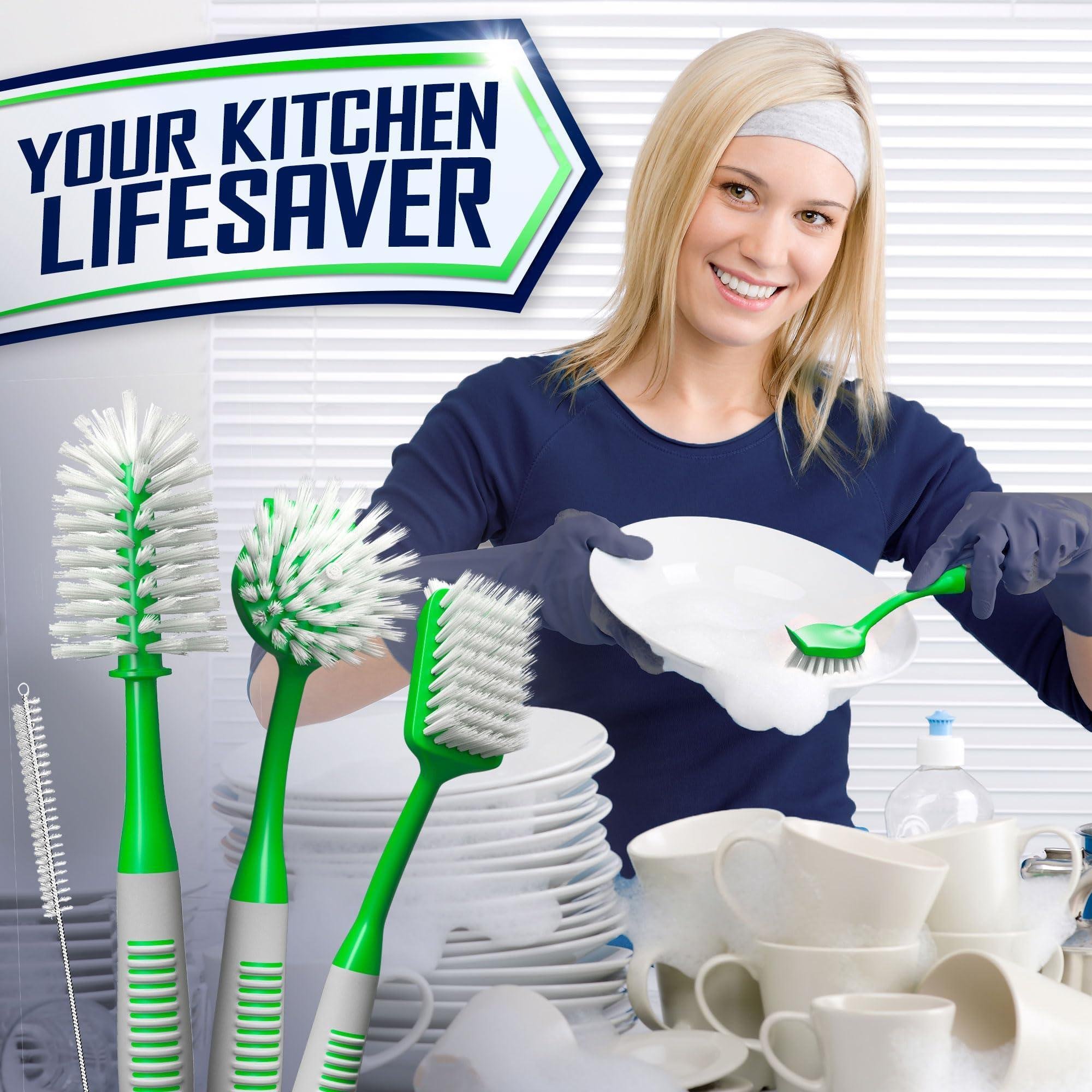 Dish Brush Set of 4 with Bottle Water Brush Scrub Brush and Scrubber Brush Green Brushes for Kitchen Ergonomic Non Slip Long Handle for Cleaning Clean